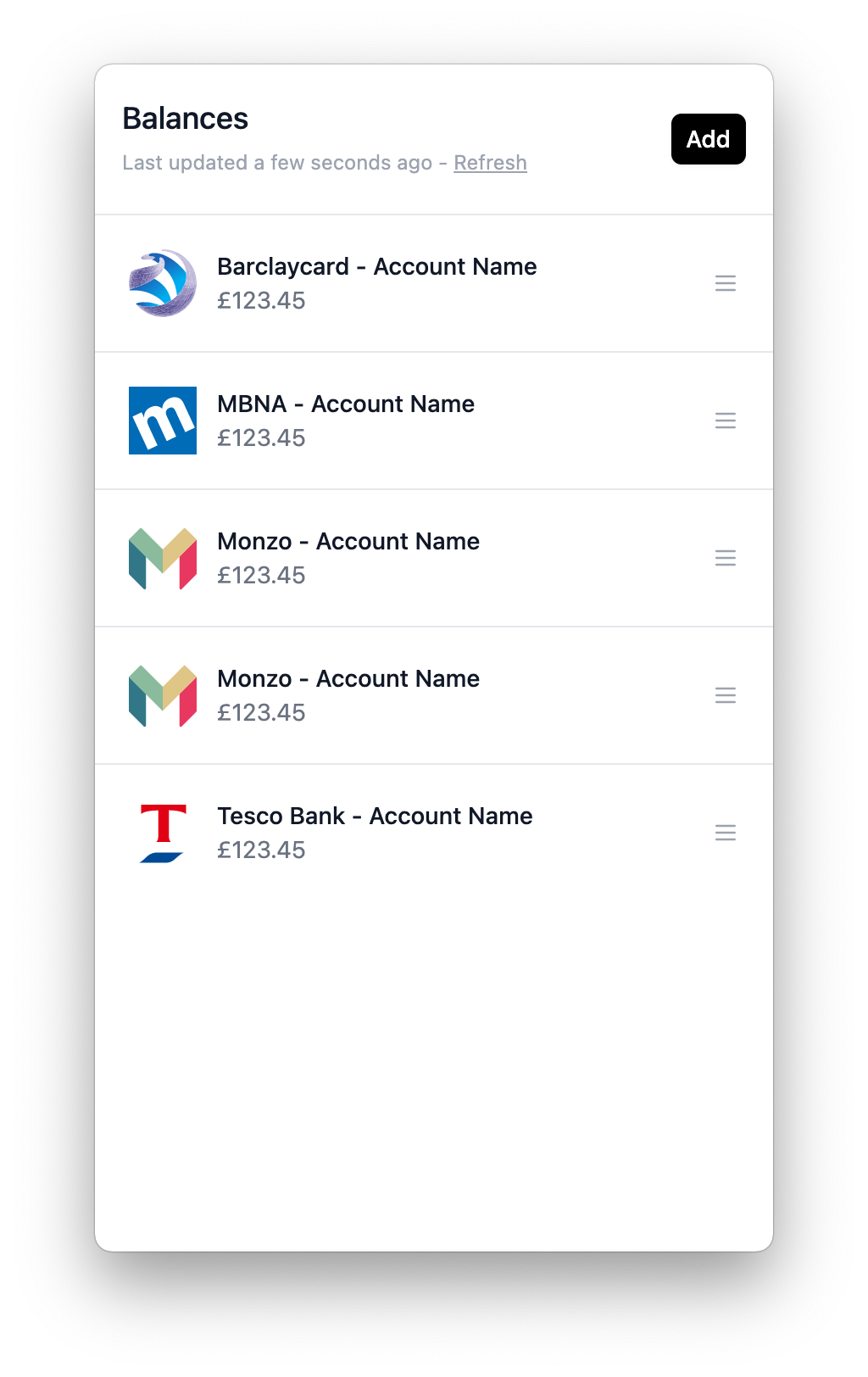 Balance Bar sits in your menu bar, so your balance are always 1 click away.